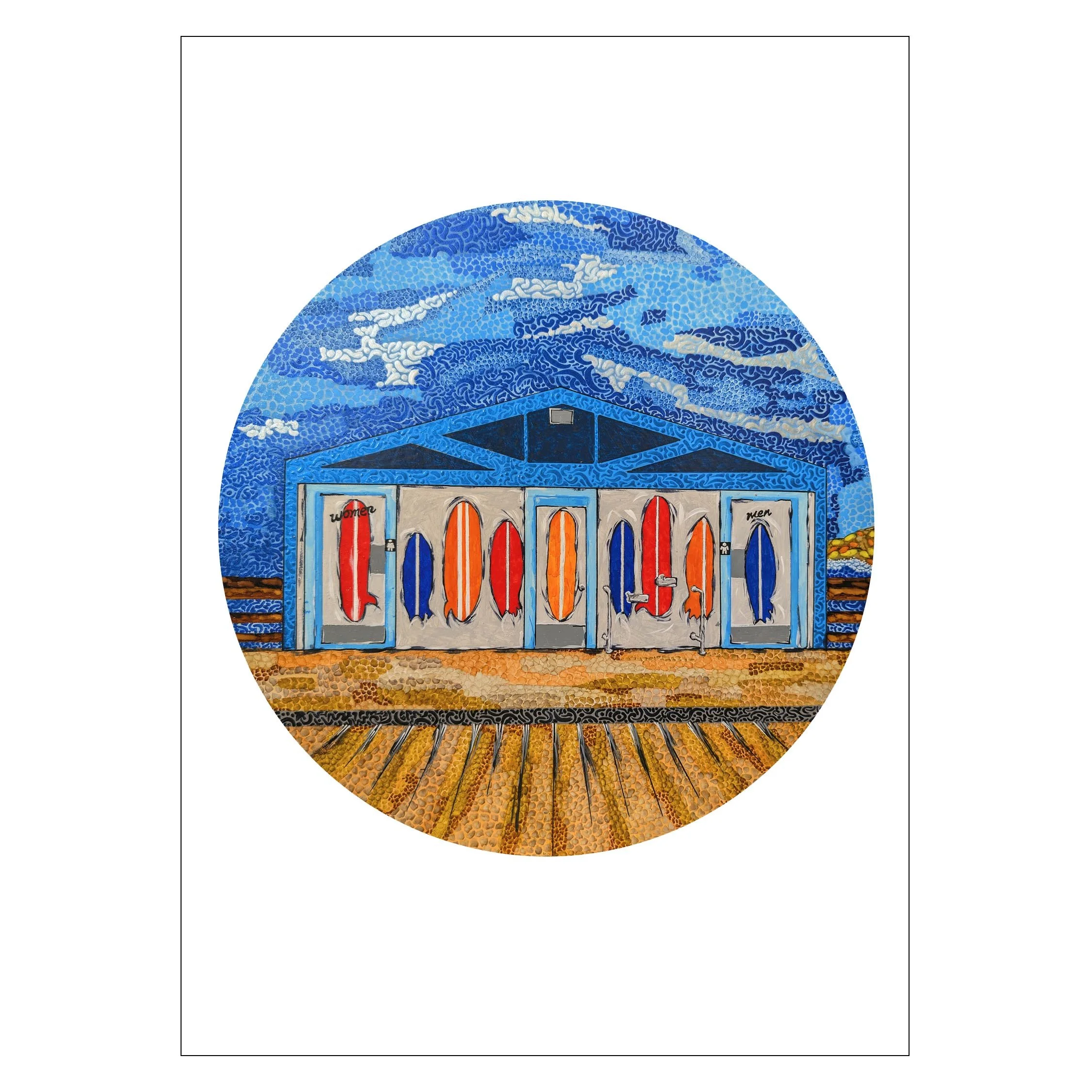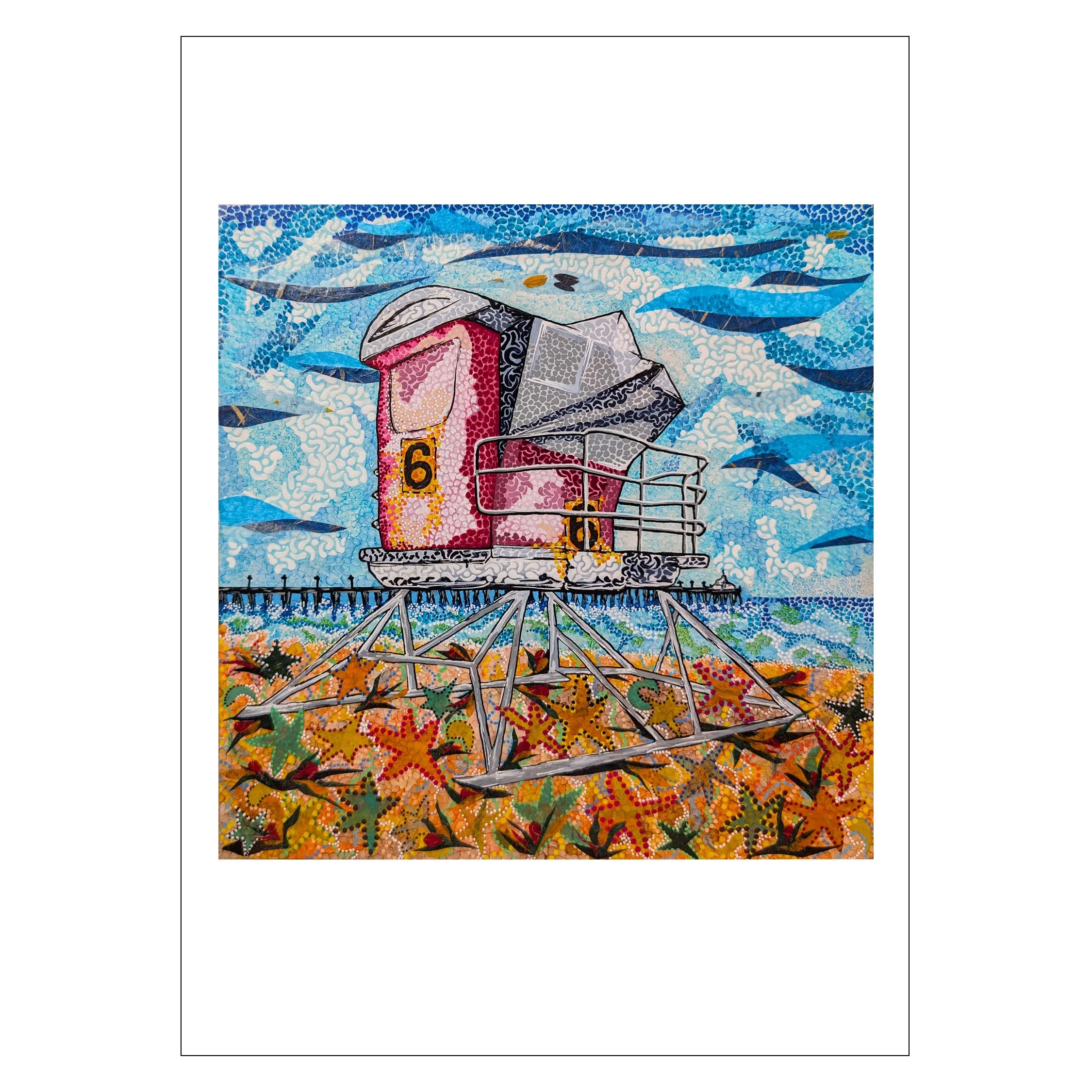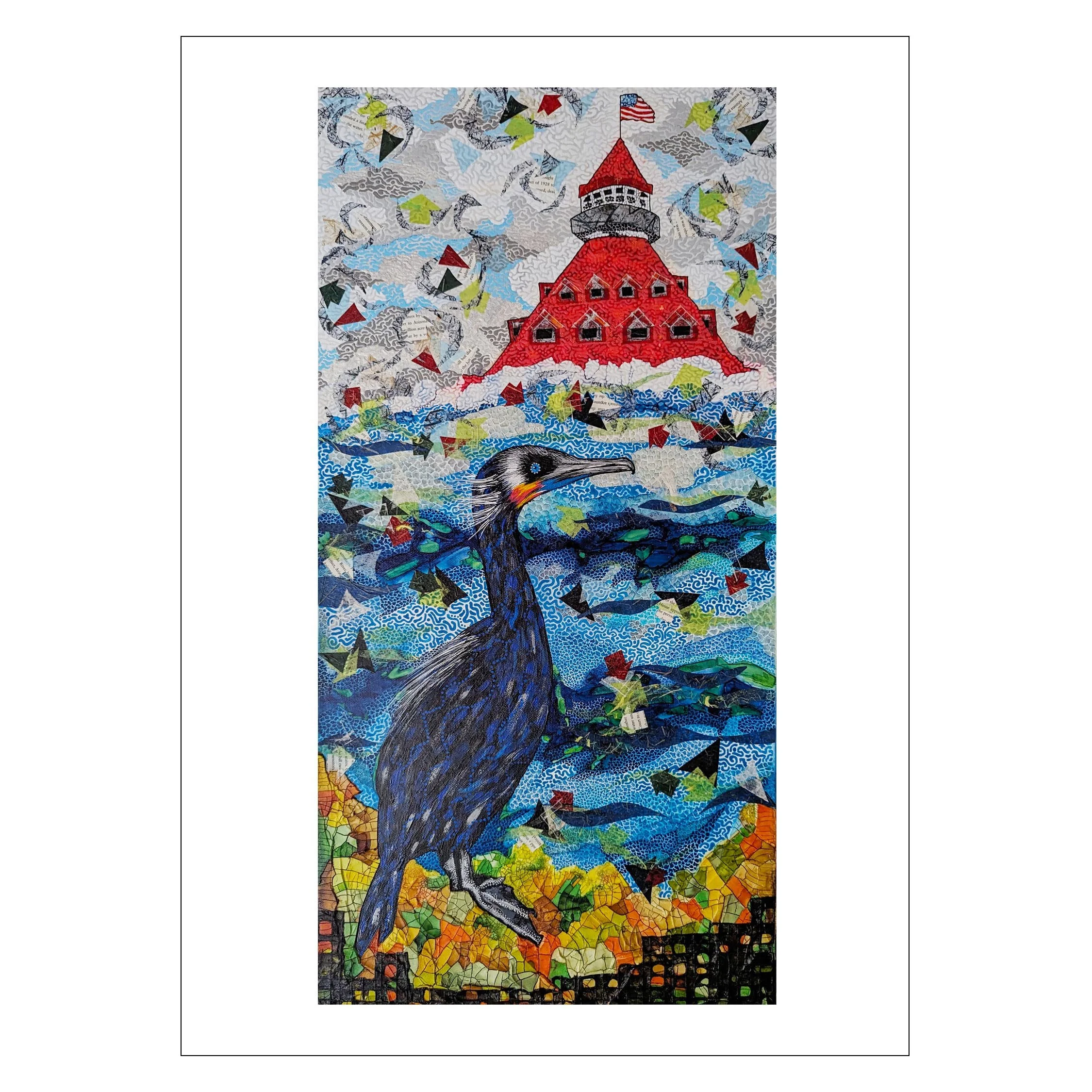 I love art! The journey of how each piece evolves is crazy, organic and unpredictable. I imagine/recall images, create with various media, add more abstract details I call “pennyglyphs” that tie images to various collaged shapes. The beginning to the final image evolves so much that it finishes up to be totally different than what I originally imagined (aka crazy). Sometimes it is hard to say “it’s done” because I keep seeing more that can be added. What’s even better about being an artist is when others see my creations, their reactions make me smile. Art makes us all happy!